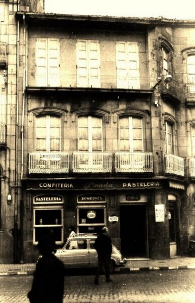 A primeira confiteria que existiu no espacio que mostramos foi a de Pumariño, pasado o tempo mercouna Abilio Prada, o material que vendia está para sempre marcado na nosa memoria…bolos de leite, cocadas…