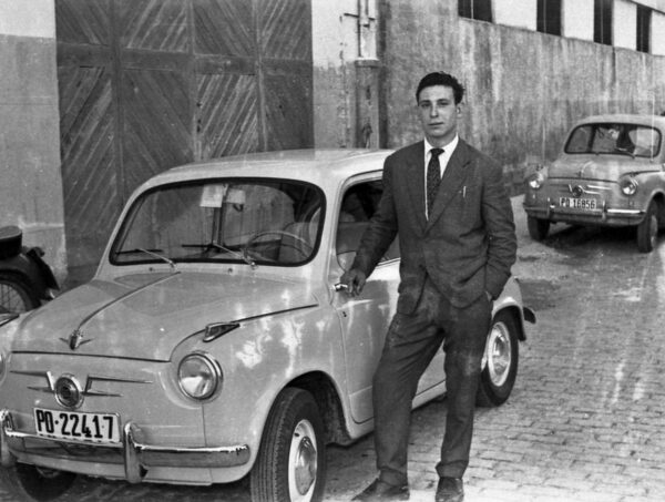 En portada, un mozo posa diante do seu Seat Seiscentos, de aquela ter un coche, un obrero era como un sono, a parede e a porta pertenecen a un lateral do Cine Cervantes.