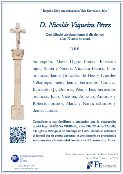 A dona de Nicolas, a os fillos a os fillos politicos, netos, irmans e cuñados o noso sentimento de pesar.