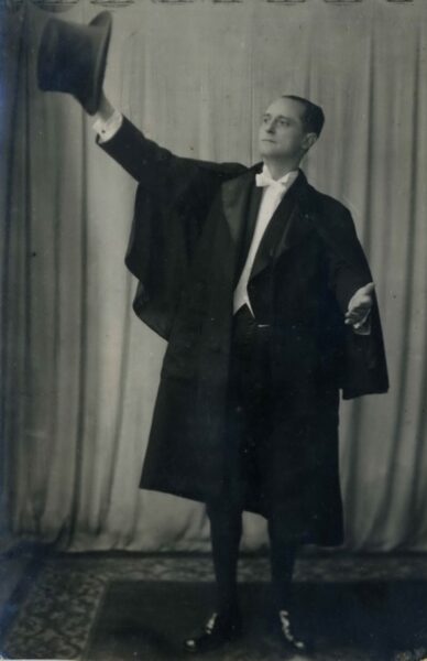 Por el smoking de mi tio, con un pantalón de tubo y capa nada habituales en esta indumentaria, creo que se trata de uno de los “apropósitos” satíricos que se celebran por Carnaval en esa Sociedad y cuya autoria era a veces de D. Ricardo Urioste, que tenia muy mala “uva” según me contaba mi madre.