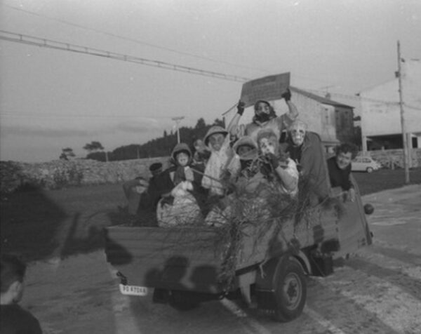 En portada, un carricoche cheo de mascaritas, de aquela os concellos non subvencionaban nada de nada, non habia Desfiles de Antroido, en realidade estaba prohibido pola dictadura de Franco, pero as Sociedades buscaron recursos para “notificar” que estaban a celebrar as festas da primavera. En Vilagarcia habia xente que se encargaba de mover o entusiasmo con moitisimo humor, falamos das charangas que recorrian o pobo de forma independiente, cada un polo seu lado, a xente iba detras a correr, eran celebres as charangas, as peñas, Solfato, Embaixada, un punto de honor pra Vilaxoan.