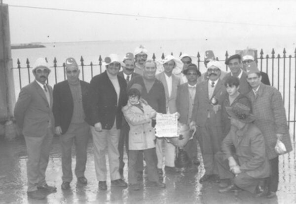 En la foto, Enrique Campos, supongo que en la parte trasera de su bar, con parte de los integrantes de la Peña Solfato, de Vilaxoán (reconozco a Escobar, Pepe Padín, Farruco Domínguez, “El Bailarín”, Chaves…).